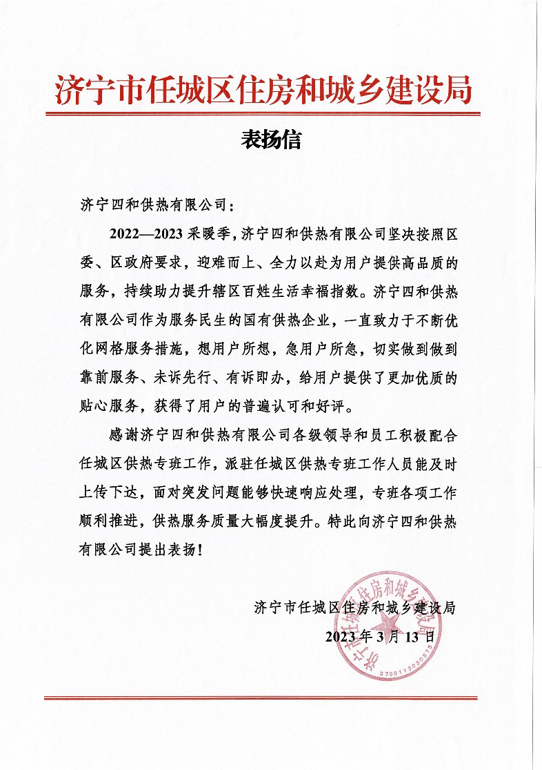近日,濟(jì)寧市任城區(qū)住房和城鄉(xiāng)建設(shè)局向濟(jì)寧四和供熱有限公司發(fā)來(lái)表?yè)P(yáng)信,對(duì)公司積極響應(yīng)區(qū)委、區(qū)政府的號(hào)召,勇于承擔(dān)保障供熱、服務(wù)民生的社會(huì)責(zé)任,千方百計(jì)克服困難,全力以赴提高供熱服務(wù)質(zhì)效,持續(xù)助力提升轄區(qū)百姓生活幸福指數(shù)提出表?yè)P(yáng)。